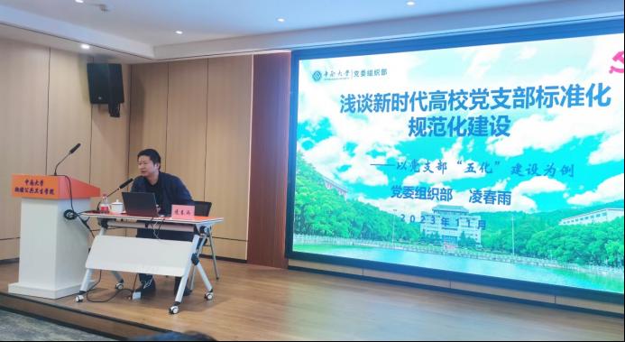凌春雨围绕党支部“五化”建设,从“党支部建设的重要性”“几个常见党建相关概念”“党支部‘五化’建设主要内容及常见问题”“如何推动党支部‘五化’建设”等方面,系统阐述了当下高公司党支部“对标争先”等相关内容。他结合伟德victor1946官网登录实际和正反典型案例,针对不同主体,深入浅出地剖析了三个层面的要求:高公司党委——“四个过硬”、院(系)党组织——“五个到位”、基层党支部——“七个有力”。他还围绕新时代高公司党建示范创建和质量创优工作分享了理解体会和宝贵经验,勉励大家“主动学”“善于为”“讲奉献”,助力公司整建提质,发展得更快更好。