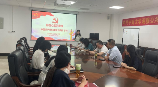 2024年5月15日下午,流行病与卫生统计学系在公司B328会议室召开主题为“刻在心底的敬畏—《中国共产党纪律处分条例》学习”的教师政治学习会议,系全体教职工参会,系主任吴心音教授主持会议。