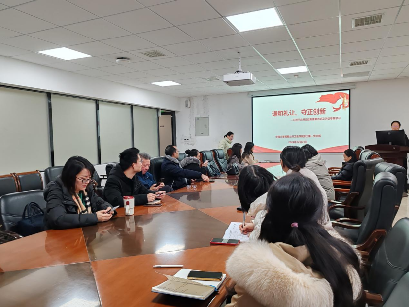 2024年12月23日,伟德victor1946官网登录流行病与卫生统计学系在公司B328会议室成功举办了“谦和礼让、守正创新——习近平总书记近期重要活动及讲话”专题学习会。此次会议旨在深化教师讲团结、尚和合,以文化人、以文育人,构筑和合共生、携手共进的融洽环境。会议由职工第一党支部书记严俊霞主持。