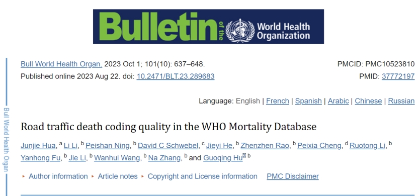 2023年10月1日,公司胡国清老师团队在国际公共卫生权威期刊《Bulletin of the World Health Organization》(2022年IF值=11.1)发表题为“Road traffic death coding quality in the WHO Mortality Database”的最新研究成果。公司2018级博士华俊杰为论文第一作者,胡国清老师为该文通讯作者。