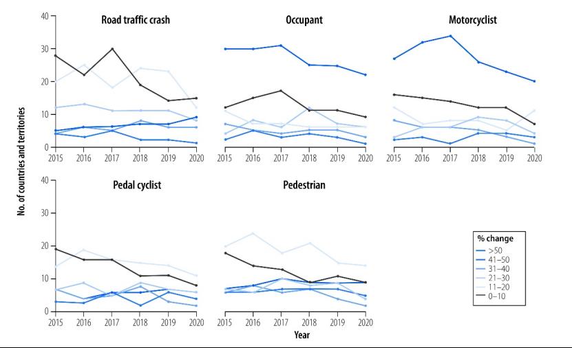 研究团队基于世界卫生组织死亡数据库评价了全球道路交通伤害死亡数据的可及性与编码质量,并估算了编码质量对重要死亡统计指标的影响。研究结果显示,2015-2020年期间,124个国家和地区向世界卫生组织报告了死亡数据,非洲、东南亚区域数据可及性较差,东南亚区域仅报告了10个年份的死亡数据。