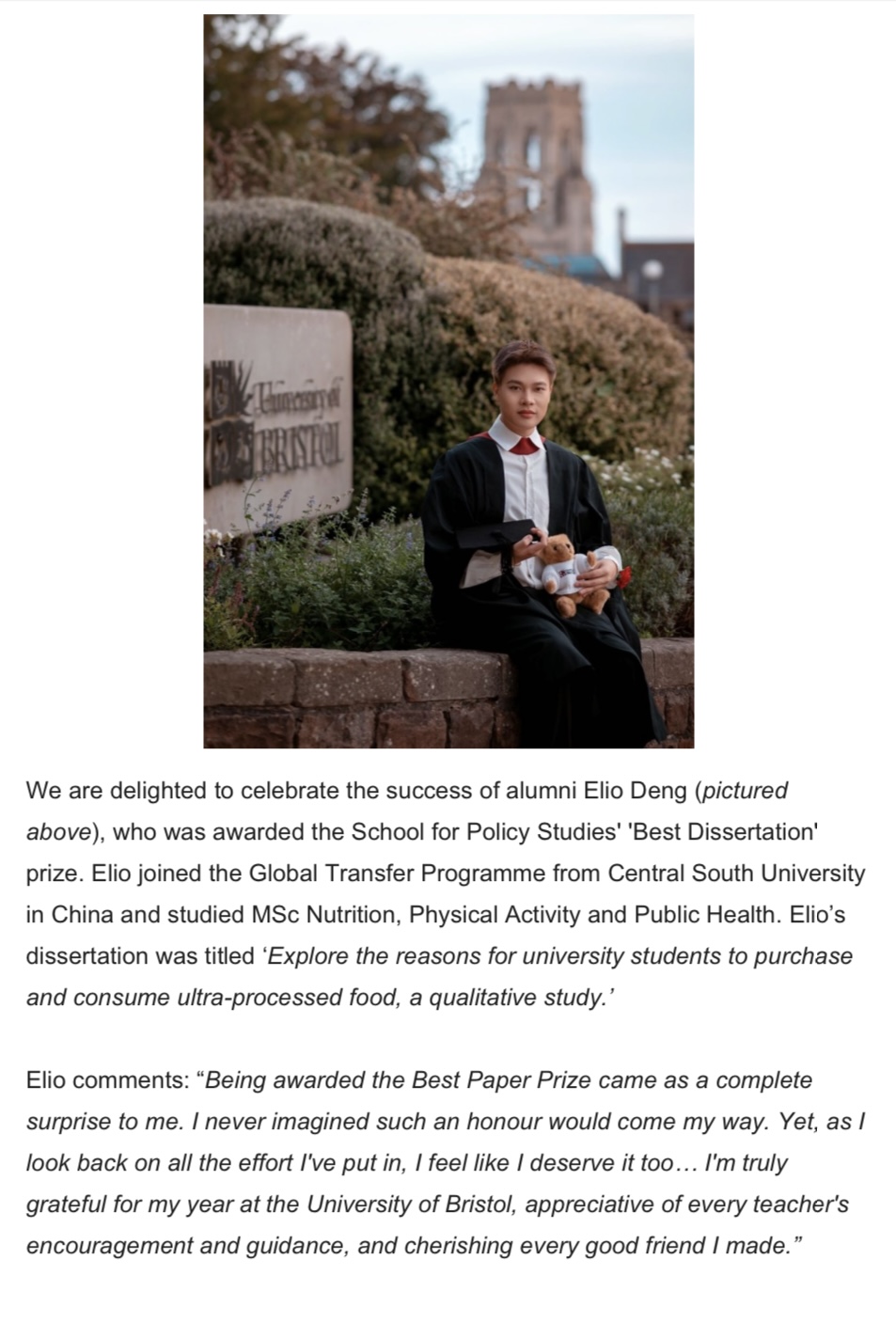 在布里斯托大学攻读Nutrition, Physical activity and Public health专业期间,邓佩凭借其优异的学术表现和突出的研究能力,荣获Distinction学位(一等荣誉学位)。他的论文“Explore the reasons for university students to purchase and consume ultra-processed food, a qualitative study”被布里斯托大学政策研究公司评为2023年年度最佳论文,并登上公司校报。