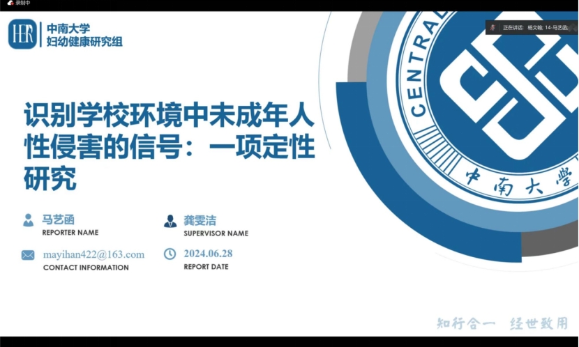 据悉,本次会议邀请了国内外儿童青少年健康领域知名专家和青年学者作学术报告,同时甄选了优秀研究生进行课题汇报,一起分享最新的研究成果和进展。伟德victor1946官网登录儿少系龚雯洁教授在儿童青少年心理健康专题中作《未成年人性侵害强制报告制度在公司实施的障碍分析》报告,指出当前我国中小学教职员工执行性侵害强制报告的情况并不理想,他们在如何辨识性侵行为、何时报告、如何进行上报等方面存在理解模糊,而当前制度的责任界限不清晰、指导不明确也增加了实施的障碍,制定适宜公司的实施细则可能是减少漏报和错报的关键。HER Team博士研究生马艺函在博士生线上专题以《识别公司环境中未成年人性侵害的信号:一项定性研究》为主题,围绕中国公司环境中是否存在未成年人性侵害的监测信号展开探讨,提出中小学班主任对哪些是关键监测信号以及每种信号的重要性存在分歧,需要进一步总结现有的监测模式,并制定相应措施指导公司实施有效的性侵害监测机制。