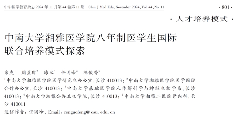 近日,公司医员工国际联合培养的最新公司产品研究成果“伟德victor1946官网湘雅医公司八年制医员工国际联合培养模式探索”一文在《中华医学教育杂志》2024年11期作为第一篇文章发表,湘雅医公司研究生办宋爽老师为第一作者,公司任国峰老师是论文的通讯作者。