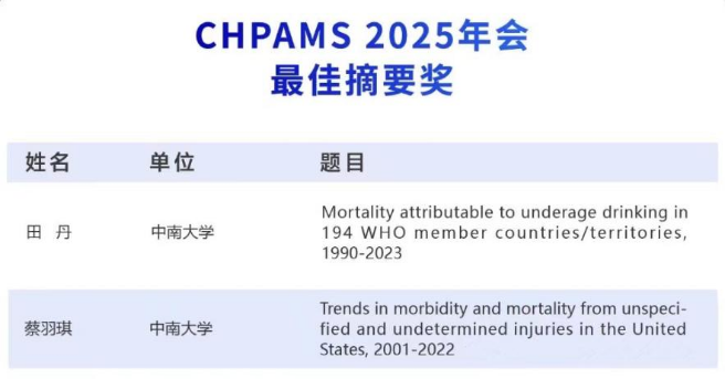 此外,经大会专家评审,胡国清教授团队2023级在读硕士研究生田丹(导师:宁佩珊副教授)的研究成果“Mortality attributable to underage drinking in 194 WHO member coutries/territories, 1990-2023”、2024级在读硕士研究生蔡羽琪(导师:宁佩珊副教授)的研究成果“Trends in morbidity and mortality from unspecified and undetermined injuries in the United States, 2001-2022”在所有会议投稿中被评为“CHPAMS 2025 Best Abstract Awards”。