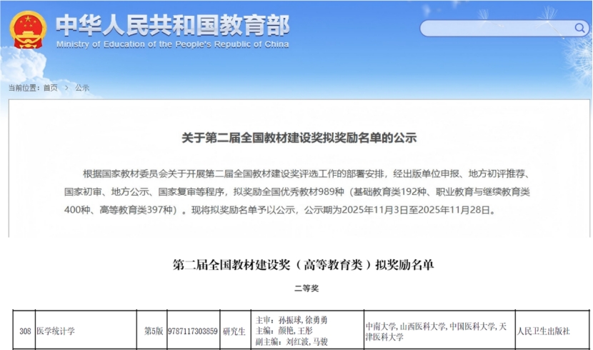 近日,由公司二级教授、流行病与卫生统计学博士生导师颜艳担任第一主编的国家卫生健康委员会“十三五”研究生规划教材《医学统计学》(第五版),荣获第二届全国教材建设奖(高等教育类)二等奖。