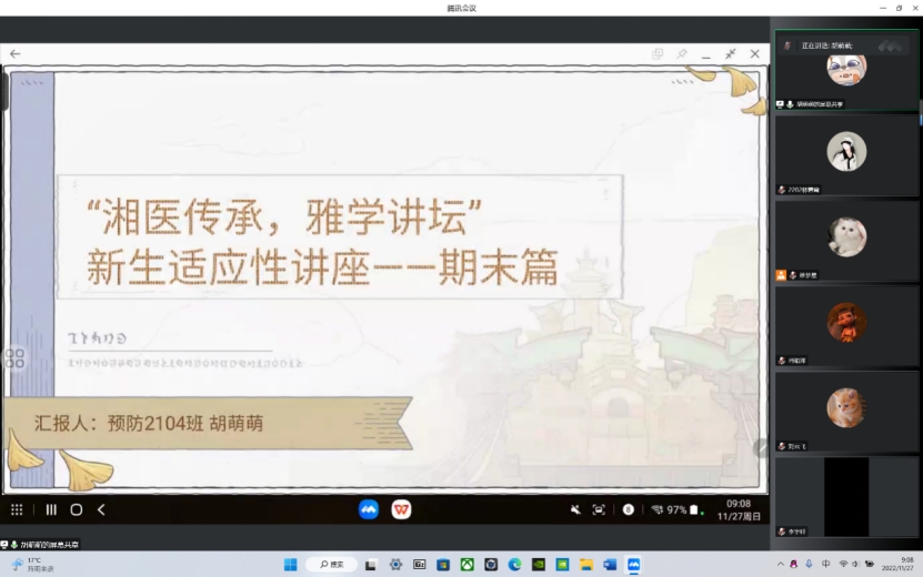 伟德victor1946官网登录讯:“湘医传承,雅学讲坛”第三场新生适应性讲座于2022年11月27日上午9:00在线上顺利举办。伟德victor1946官网登录辅导员肖铂洋及2022级全体新生共同参与了此次活动,本场讲座由非临五2206班邵凡宁同学主持,胡萌萌、陈益言、王思宇、邹苏阳四位2021级同学担任主讲嘉宾。本场讲座的主要目的是解决2022级新生在学习、生活、心理等方面遇到的问题,使同学们以一种积极向上的心态备战期末考试,改进学习方法,处理情绪问题,开拓人际交往,从而更好地适应老员工活。