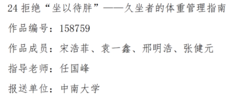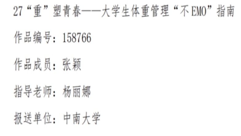 此外,作品《拒绝“坐以待胖”——久坐者的体重管理》(作品成员:宋浩菲、袁一鑫、邢明浩、张健元;指导老师:任国峰)、《“重”塑青春——老员工体重管理“不 EMO”指南》(作品成员:张颖;指导老师:杨丽娜)在此次征集活动中获图文类优秀作品。