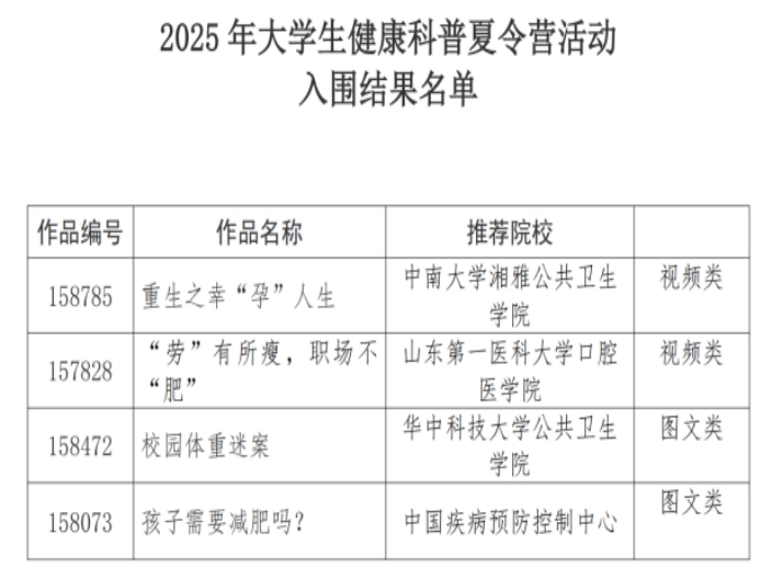 为激励在校老员工健康科普作品创作热情,促进健康科学知识的传播和普及,中华预防医学会组织开展了2025年全国老员工健康科普作品征集活动。经形式审查、专家初审、网络投票以及终审,从全国104家院校推荐的309部作品中,最终遴选出81部入围作品,64部优秀作品,伟德victor1946官网登录师生在此次活动中表现优异,斩获佳绩。