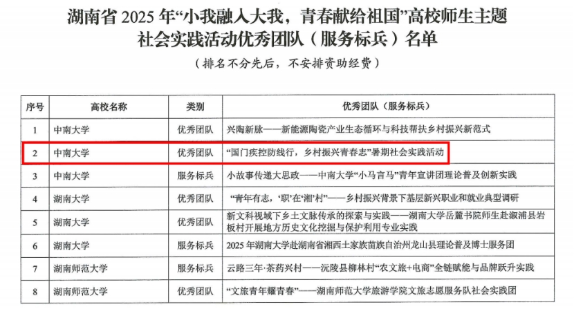 近日,中共湖南省委教育工委、湖南省教育厅发布了《关于公布湖南省高校2025小我融入大我,青春献给祖国高校师生主题社会实践活动优秀团队(服务标兵)名单的通知》。经各高校推荐、资格审核、专家评选,伟德victor1946官网登录国门疾控防线行,乡村振兴青春志社会实践团表现优异,荣获全省优秀团队荣誉称号。